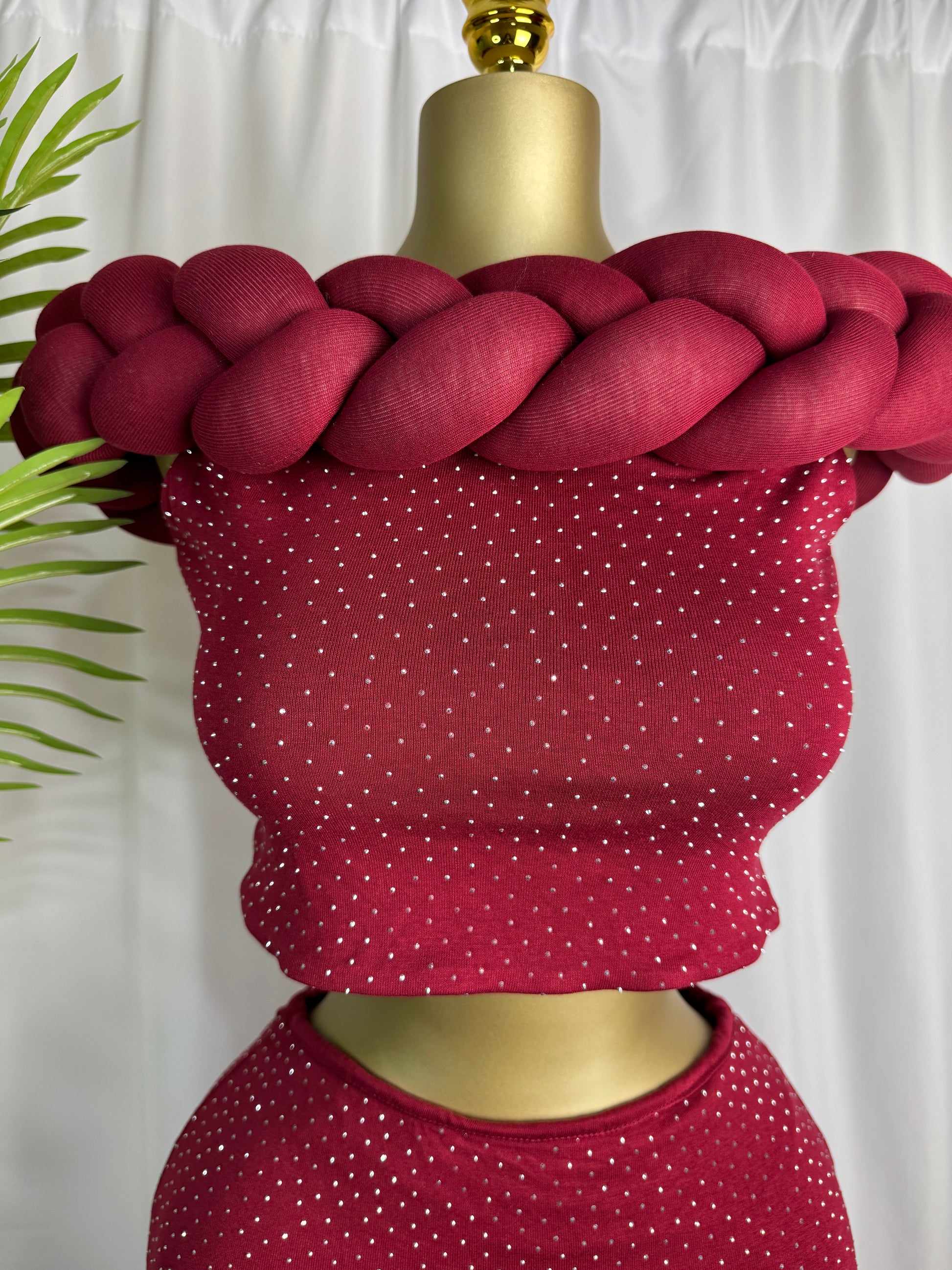 Elevate your wardrobe with this stunning two-piece crimson ensemble, designed for women who love bold elegance and modern femininity. The top features a beautifully crafted braided statement neckline, giving the outfit a luxurious, couture-inspired finish. Subtle sparkling embellishments add a touch of glamour across the fitted crop top and matching high-waist skirt.